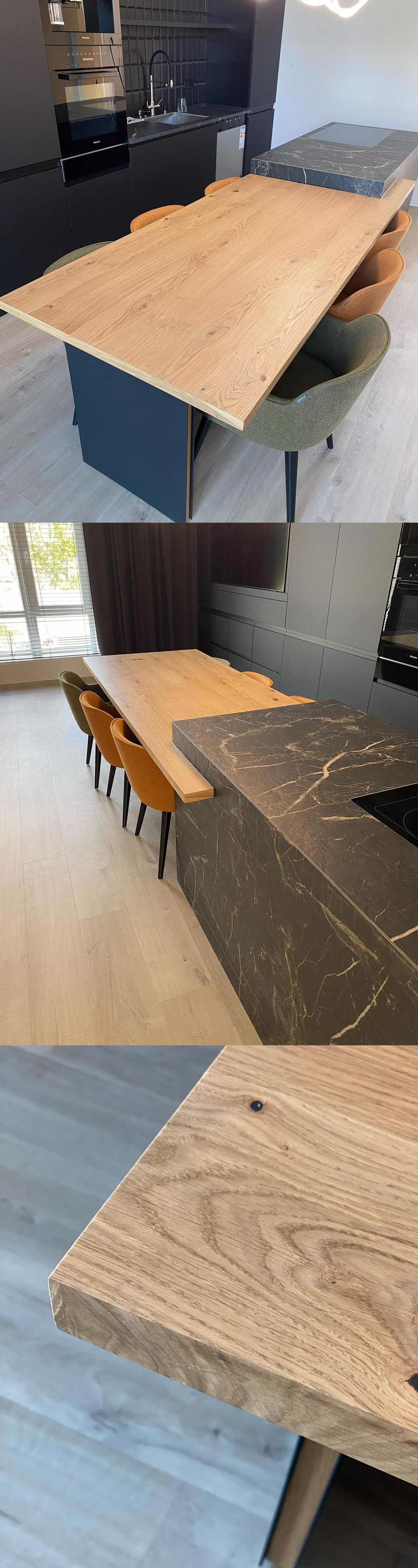 This stylish kitchen boasts black acrylic fronts and a durable porcelain worktop. The standout feature is the island, crafted from real oak and porcelain stoneware, blending natural warmth with modern elegance. The combination of materials and sleek design creates a sophisticated, functional space.