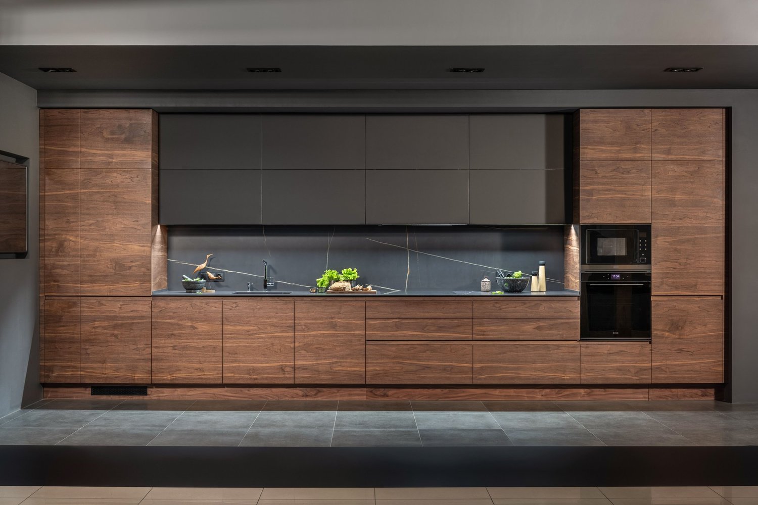 This exquisite kitchen blends modern design with natural wood veneers, creating a warm yet contemporary feel. High-end materials such as real stone, milled painted MDF, and Blum fittings complete the look, making it a perfect balance of elegance and functionality.