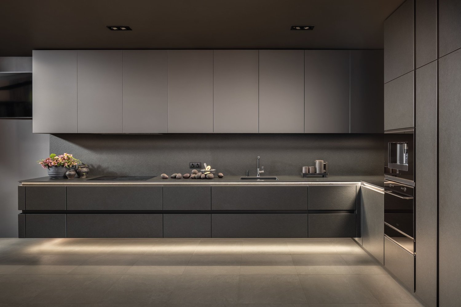 A premium suspended kitchen with lower fronts of porcelain stoneware and upper cabinets in FENIX material. Embracing a modern minimalist style, it features integrated appliances, under-cabinet lighting, and luxurious materials like real stone and metal accents.