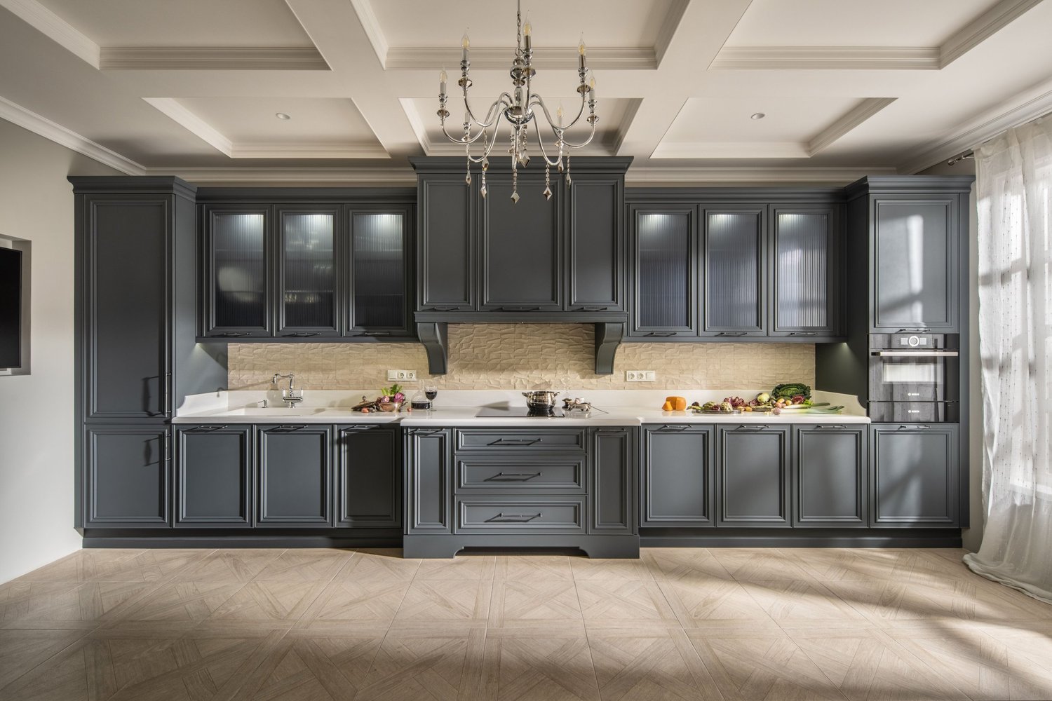 A traditionally styled kitchen boasting detailed cabinet doors, decorative mouldings, and a stunning chandelier. Made from premium materials including real stone, milled painted MDF, and Blum fittings, it combines classic design with modern luxury and superior craftsmanship.